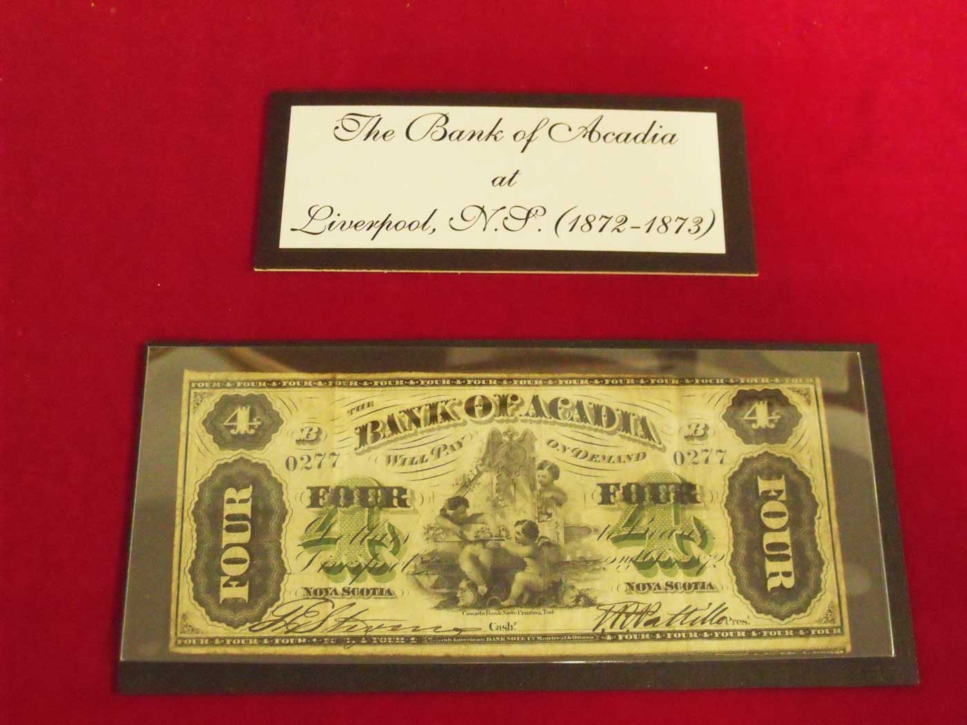 During the 1870’s, Liverpool had two (short-lived) banks: Bank of Acadia and Bank of Liverpool. Both banks issued their own currency. See Bank of Acadia note shown on the right.